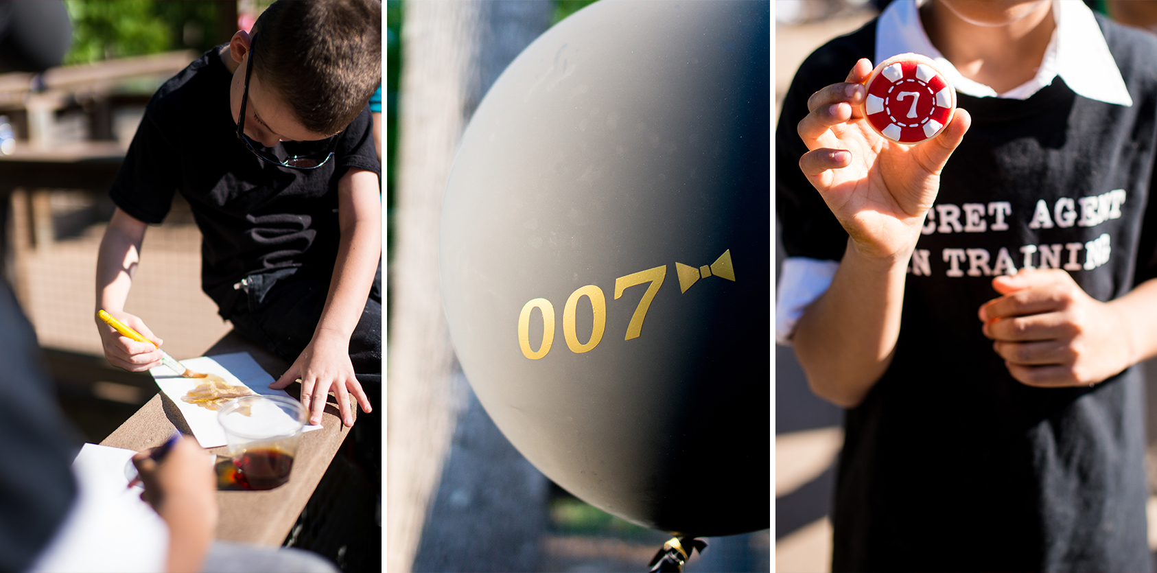 A spy party is fun for any age group (yes, adults too!) but it was especially PERFECT for this 7 year old, because it gave me a chance to incorporate the 007 James Bond theme as well! This party was held outdoors, but an indoor version could include an escape room for entertainment.