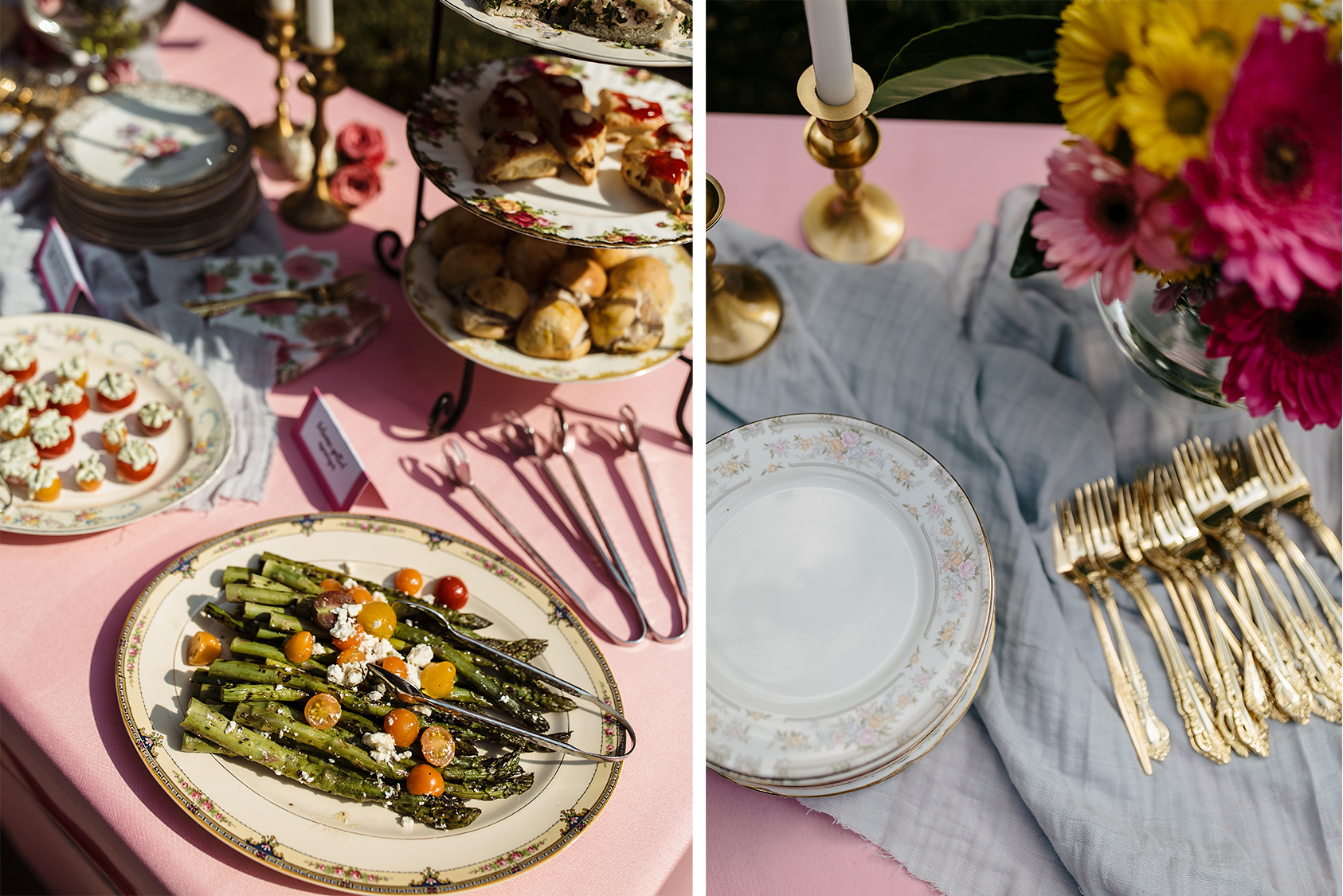 We rented some gorgeous vintage mismatched teacups and saucers from Vintage English Teacup, and pulled color inspiration from those pieces for the rest of the decor. Combining those with antique milk glass vases and nature-inspired details yielded a final look that was delicate, feminine and still child-like!